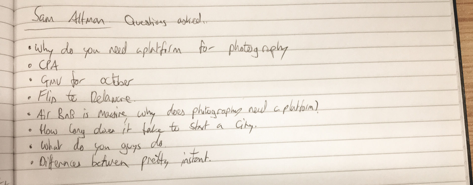 The interview came and went in a flash. Four partners (Sam Altman, Kirsty Nathoo, Daniel Gross and Fred Benenson) peppered us with questions for around ten minutes. None of the questions came as a surprise, so our answers were very snappy. We had brought a few printed-out charts into the interview with us to help explain a few points. Sam asked us the longest and most complicated question of the interview, around how we would 'win' in this space. After I pulled out a price-sensitivity chart highlighting how we were opening up new markets for photography, he pulled us up and said "yep, you've answered my question".