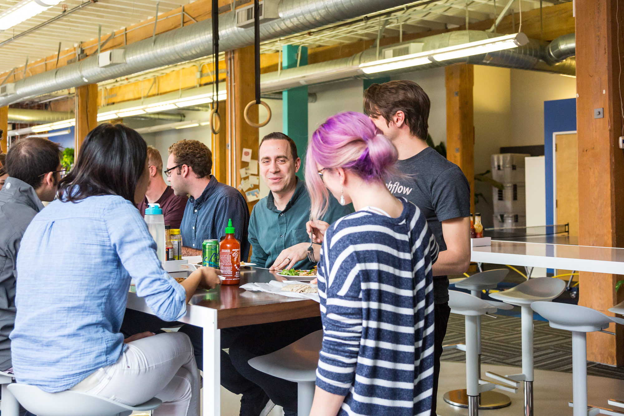 As lunchtime approaches, the space becomes a little less quiet. People wander around to trade notes about common projects, and a bit of muffled banter and laughter breaks out. People slowly make their way over to the kitchen, where a catered lunch is being served. Sergie entertains the crowd while Vlad is off in the far corner sorting out a time-sensitive issue that has just popped up.
